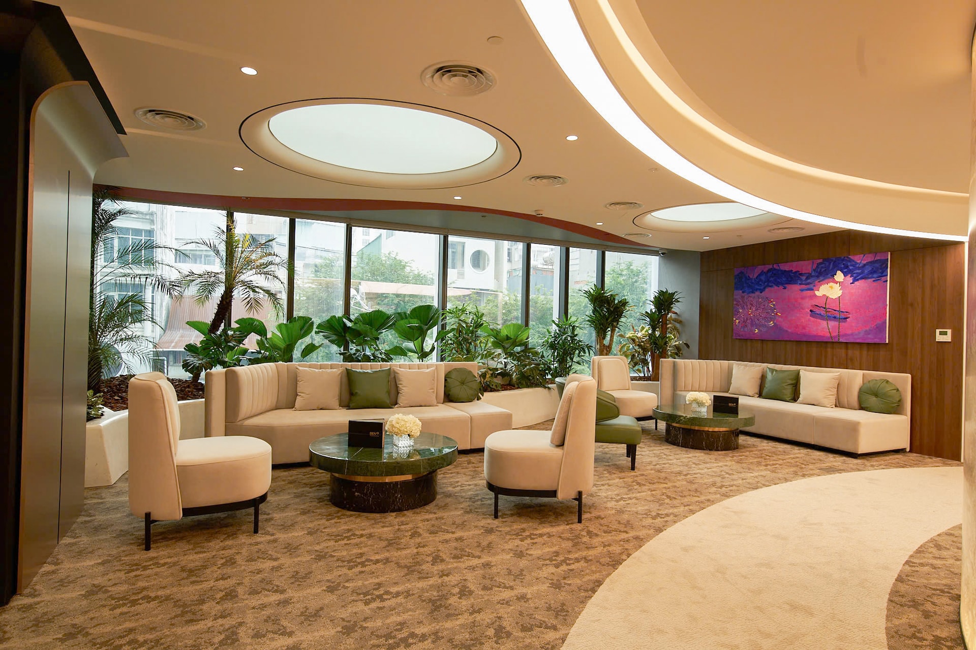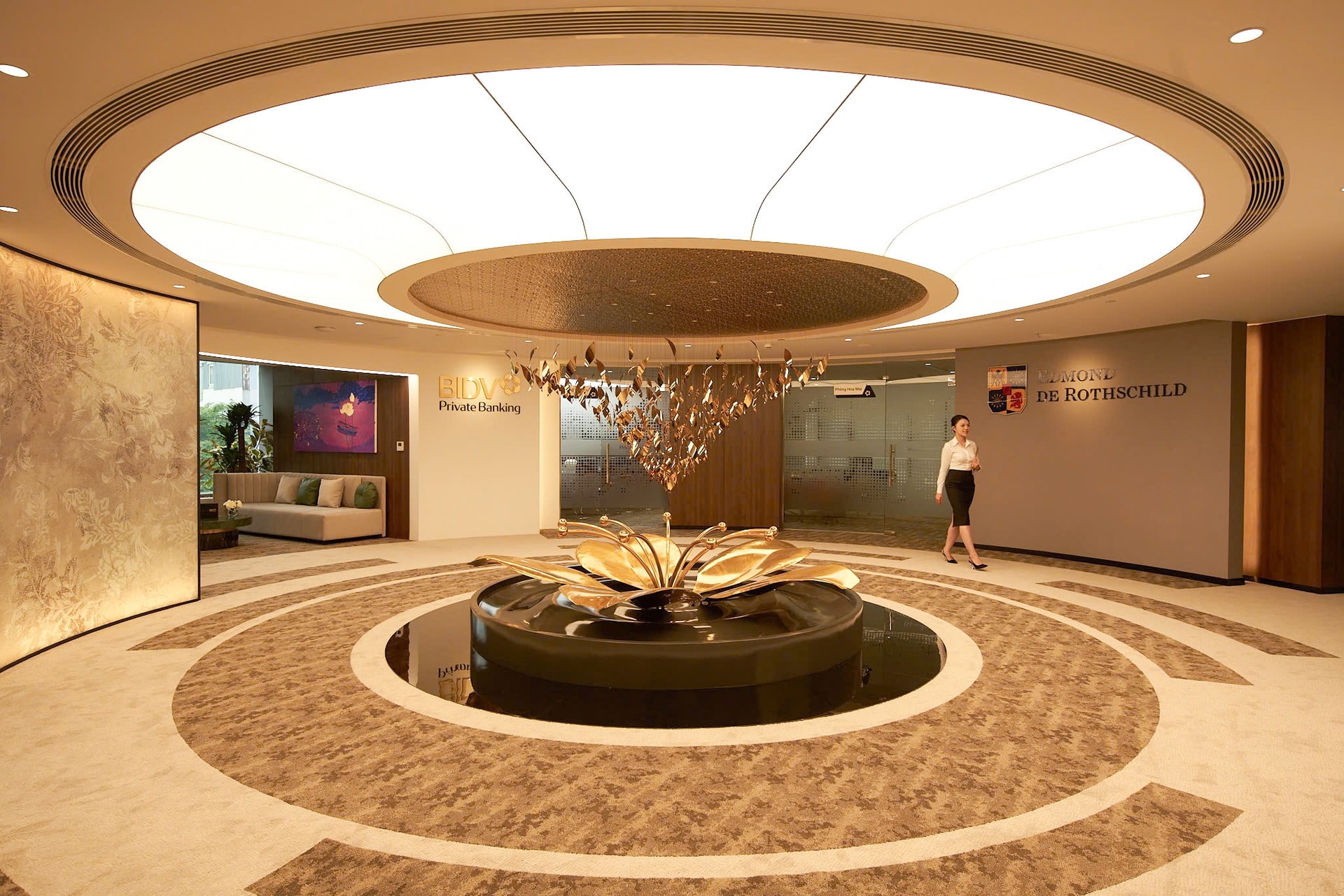 The Private Banking Center offers a seamless blend of natural elegance and cultural refinement, harmonizing tradition with modernity. A standout feature is its grand lobby, adorned with a radiant golden apricot blossom - a symbol of BIDV’s commitment to excellence, prosperity, and an ambitious vision for the future.
