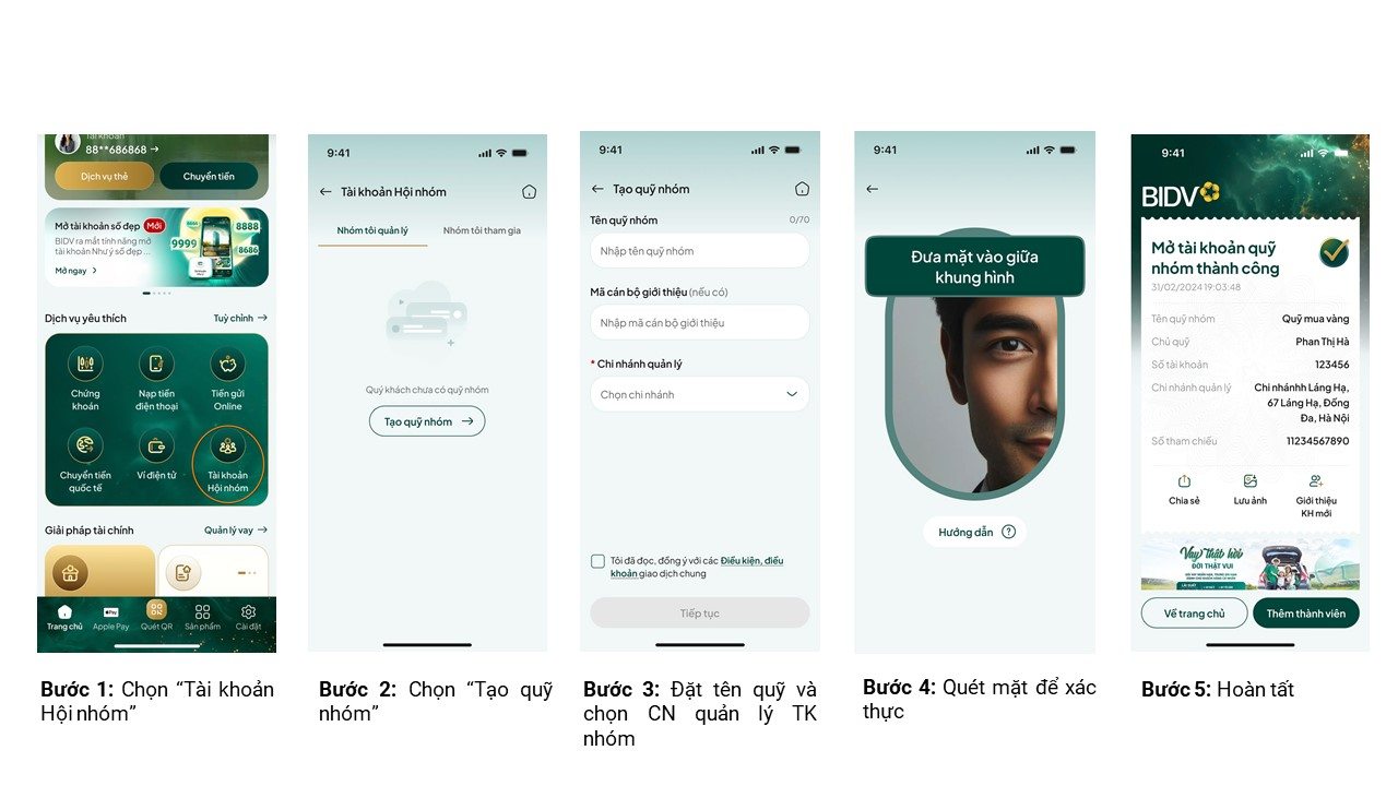 Log in to the app and select the Group Account section, then choose Open Group Fund, enter the group fund information, and then add members by searching for their registered BIDV SmartBanking phone numbers.