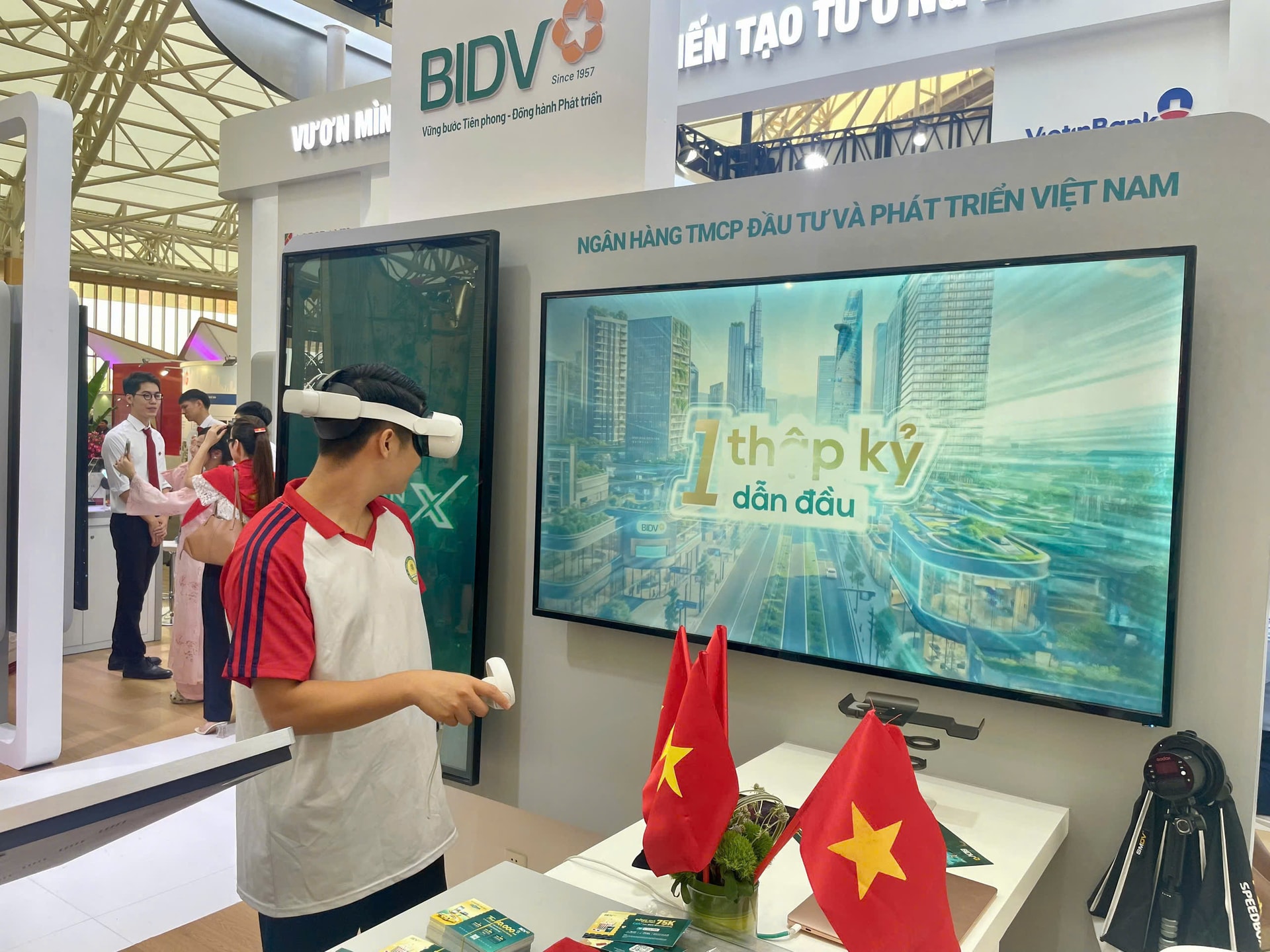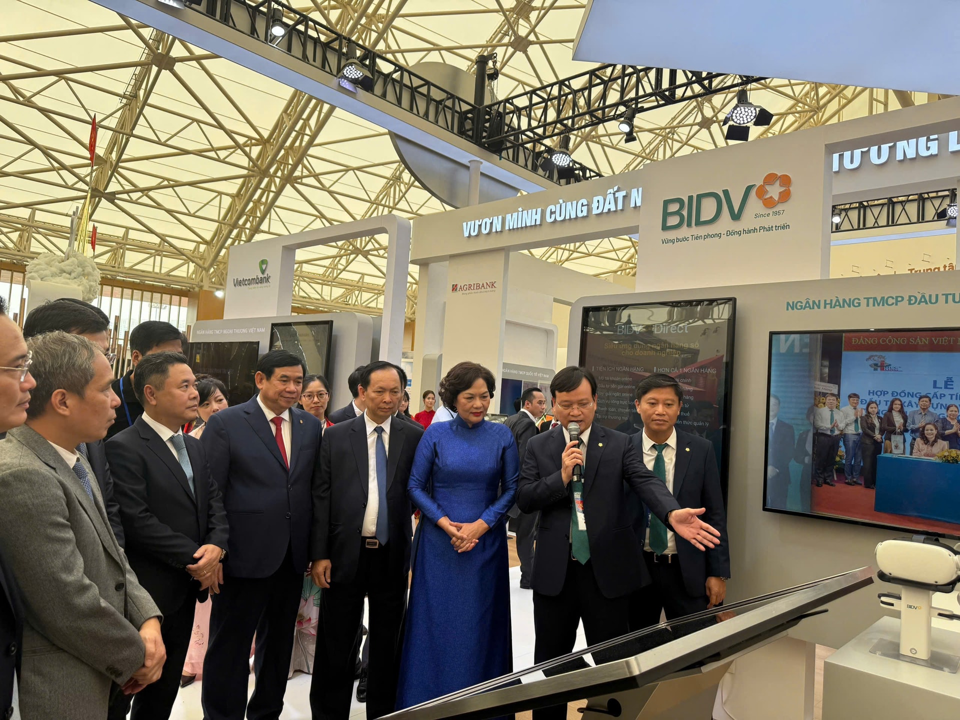 BIDV는 국립은행의 넓고 인상적인 전시 부스 옆 공간을 통해 방문객들이 은행 전시 공간을 방문하는 첫 번째 목적지로 삼고, 독특한 디지털 상품 및 서비스 체험과 다양한 매력적인 선물을 제공합니다. "개발, 창조"라는 주제로 은행 산업을 소개하는 종합 전시 공간에서는 은행 산업과 국가 경제에 기여해 온 역사와 사명을 보여주는 이미지들을 전시할 뿐만 아니라, 기관 및 개인을 위한 디지털 뱅킹 서비스를 직접 체험할 수 있는 기회를 제공합니다.
